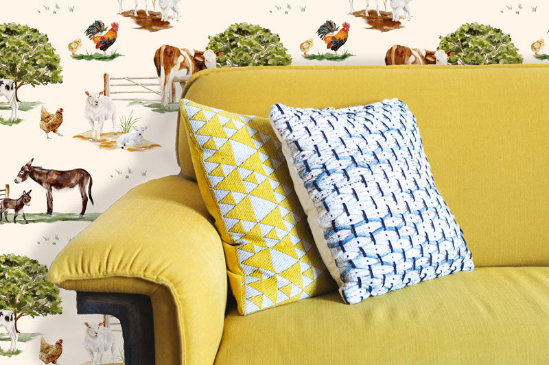 Head back to the farm with this lovely peel and stick farm animal wallpaper pattern. Check out the baby calf, goat, sheep and chick... heck there's even a donkey for you to enjoy. This pattern will look great as an accent wall or in an entire room in your home. Don't delay buy this adorable pattern today.
