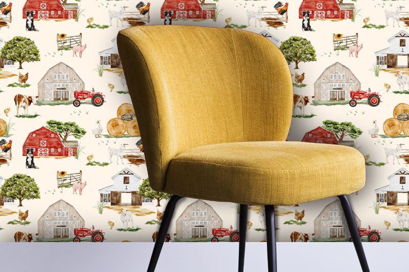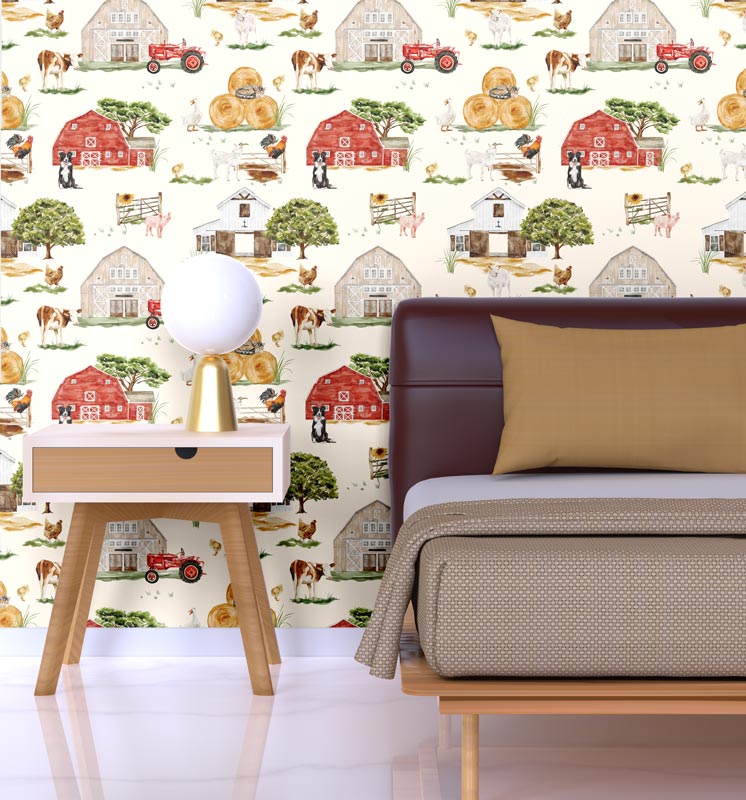Do you love the farm? Here's a great way to enjoy it every day in your favorite space. Simply install this amazing farm peel and stick wallpaper pattern on your smooth or semi smooth finished walls. Enjoy the red tractor, rooster, chicken, sheep, hay, barns, goose, the farm dog and more.