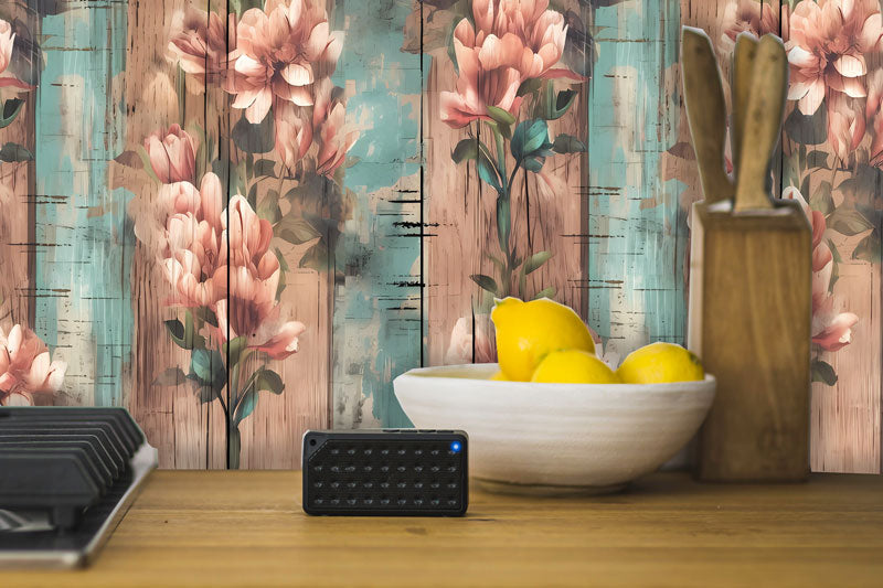 Pink Floral on Blue and Brown Distressed Wood Removable Wallpaper